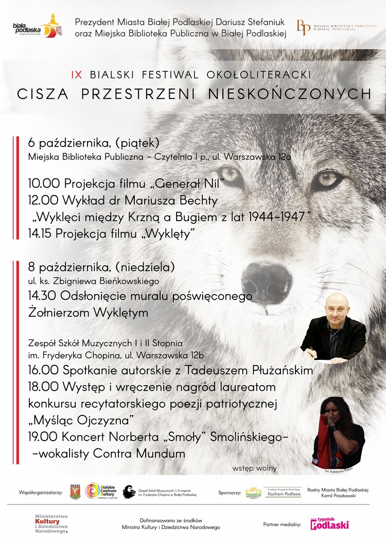 Miejska Biblioteka Publiczna w Białej Podlaskiej zaprasza na IX Bialski Festiwal Okołoliteracki w dniach 6-8 października 2017 roku. Hasłem dziewiątej edycji festiwalu, "Cisza przestrzeni nieskończonych", jest fragment wiersza Tadeusza Płużańskiego, najbliższego współpracownika Witolda Pileckiego. Przy wsparciu Prezydenta Dariusza Stefaniuka, Ministerstwa Kultury i Dziedzictwa Narodowego, Fundacji Grzegorza Biereckiego „Kocham Podlasie” oraz radnego miasta Kamila Paszkowskiego możemy Państwu zaproponować w tych dniach silną dawkę emocji literackich, muzycznych, filmowych i patriotycznych.