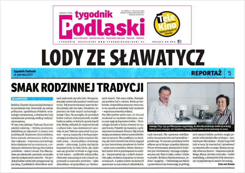 WYWODZĄCE SIE ZE SŁAWATYCZ LODY CHYZA TO LODY Z PONAD 55-LETNIĄ TRADYCJĄ ZNANE W CAŁYM REGIONIE POWIATU BIALSKIEGO ZE SWEJ JAKOŚCI I SMAKU.
