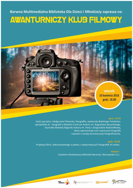10 kwietnia o godz. 18.00, wyjątkowo w drugi wtorek miesiąca, zapraszamy na niezwykły Awanturniczy Klub Filmowy, na którym gościem specjalnym będzie Małgorzata Piekarska - opiekunka Bialskiego Fotoklubu, specjalistka od fotografii w Bialskim Centrum Kultury im. Bogusława Kaczyńskiego. Piekarska w 2011 roku otrzymała Bialską Nagrodę Kultury im. Anny z Sanguszków Radziwiłłowej II stopnia za dorobek twórczy, wytrwałe popularyzowanie różnych form fotografii artystycznej oraz promocję bialskiego środowiska fotograficznego. Po wykładzie o pasji fotografowania, obejrzymy film dokumentalny o jednej z najsłynniejszych fotografek XX wieku.