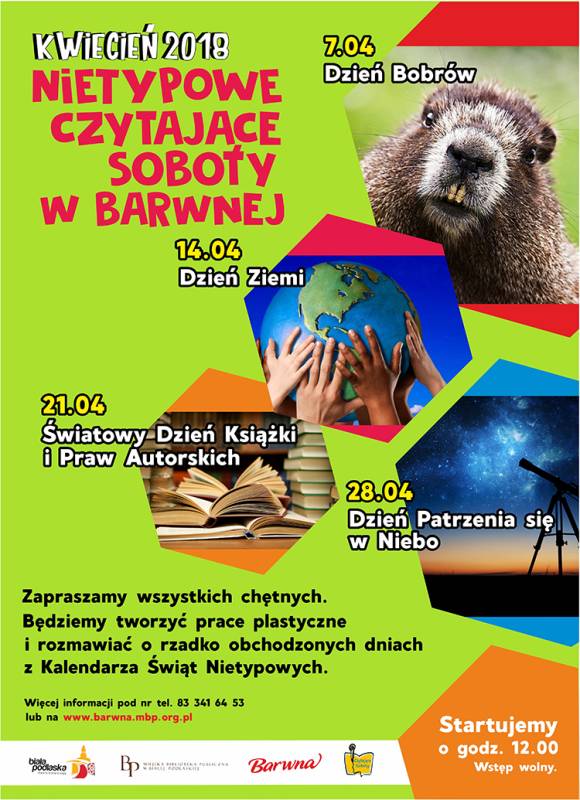 Rozpoczynamy nowy cykl Czytających Sobót. Tym razem motywem przewodnim będą nietypowe święta przypadające dokładnie w każdą kwietniową sobotę. Tak jak my obchodzimy imieniny, tak i bobry obchodzą swoje święto. Czy wiedzieliście o tym? Zapraszamy całe rodziny na godz.12.00 do Multimedialnej Biblioteki dla Dzieci i Młodzieży „Barwna” przy ulicy Warszawskiej 12c. Więcej informacji na plakacie.