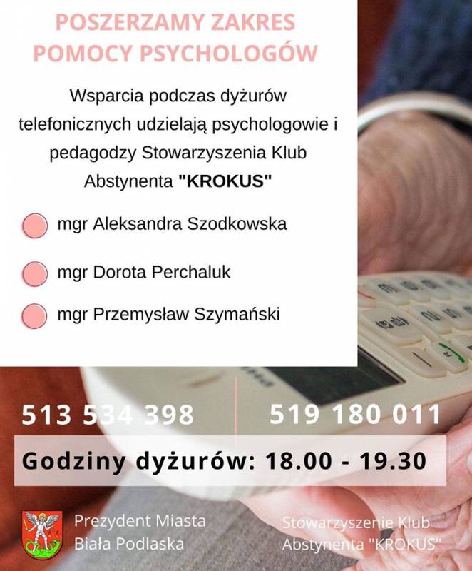 Pracownicy MOPS i Poradni Psychologiczno-Pedagogicznej oraz współpracujących z Urzędem Miasta stowarzyszeń udzielają bezpłatnych konsultacji psychologicznych mających na celu wsparcie mieszkańców odczuwających niepewność, trudności w codziennym funkcjonowaniu, odczuwających lęk w związku z epidemią koronawirusa. Z inicjatywy prezydenta Michała Litwiniuka uruchomione zostały specjalne linie telefoniczne.