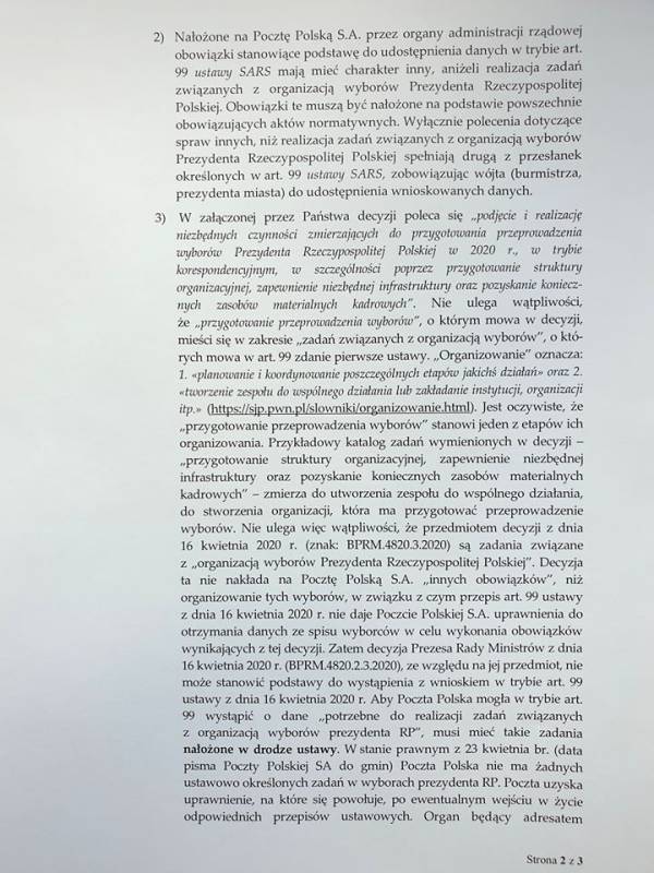 z „organizacją wyborów Prezydenta Rzeczypospolitej Polskiej”. Decyzja ta nie nakłada na Pocztę Polską S.A. „innych obowiązków”, niż organizowanie tych wyborów, w związku z czym przepis art. 99 ustawy z dnia 16 kwietnia 2020 r. nie daje Poczcie Polskiej S.A. uprawnienia do otrzymania danych ze spisu wyborców w celu wykonania obowiązków wynikających z tej decyzji. Zatem decyzja Prezesa Rady Ministrów z dnia 16 kwietnia 2020 r. (BPRM.4820.2.3.2020), ze względu na jej przedmiot, nie może stanowić podstawy do wystąpienia z wnioskiem w trybie art. 99 ustawy z dnia 16 kwietnia 2020 r. Aby Poczta Polska mogła w trybie art. 99 wystąpić o dane „potrzebne do realizacji zadań związanych z organizacją wyborów prezydenta RP”, musi mieć takie zadania nałożone w drodze ustawy. W stanie prawnym z 23 kwietnia br. (data pisma Poczty Polskiej SA do gmin) Poczta Polska nie ma żadnych ustawowo określonych zadań w wyborach prezydenta RP. Poczta uzyska uprawnienie, na które się powołuje, po ewentualnym wejściu w życie odpowiednich przepisów ustawowych. Organ będący adresatem wniosku zobowiązany jest ustalić, czy wnioskowane dane są potrzebne do realizacji zadań związanych z organizacją wyborów Prezydenta Rzeczypospolitej Polskiej ,bądź w celu wykonania innych obowiązków nałożonych przez organy administracji rządowej. W opinii Prezydenta Miasta Biała Podlaska nie wykazaliście Państwo, by dane takie były do tego celu potrzebne; - W dniu 18 kwietnia 2020 roku, tj. po wydaniu Decyzji, wszedł w życie 102 ustawy SARS. Zgodnie z tym przepisem, w okresie obowiązywania stanu zagrożenia epidemicznego albo stanu epidemii przy przeprowadzaniu wyborów powszechnych na Prezydenta Rzeczypospolitej Polskiej zarządzonych w 2020 r. nie stosuje się przepisów ustawy z dnia 5 stycznia 2011 r. - Kodeks wyborczy w zakresie m.in. głosowania korespondencyjnego, o którym mowa w art. 53a k. w. Mając powyższe na uwadze należy przyjąć, iż od dnia 18 kwietnia 2020 roku decyzja nie jest skuteczna i nie może być wykonana, bowiem przepisy dotyczące głosowania w trybie korespondencyjnym zostały zawieszone - nie mogą być stosowane do czasu zakończenia stanu epidemii. Jej dalsze wykonywanie będzie możliwe do zniesieniu stanu epidemii, o ile nastąpi to przed wyborami Prezydenta RP zarządzonymi w 2020 roku;