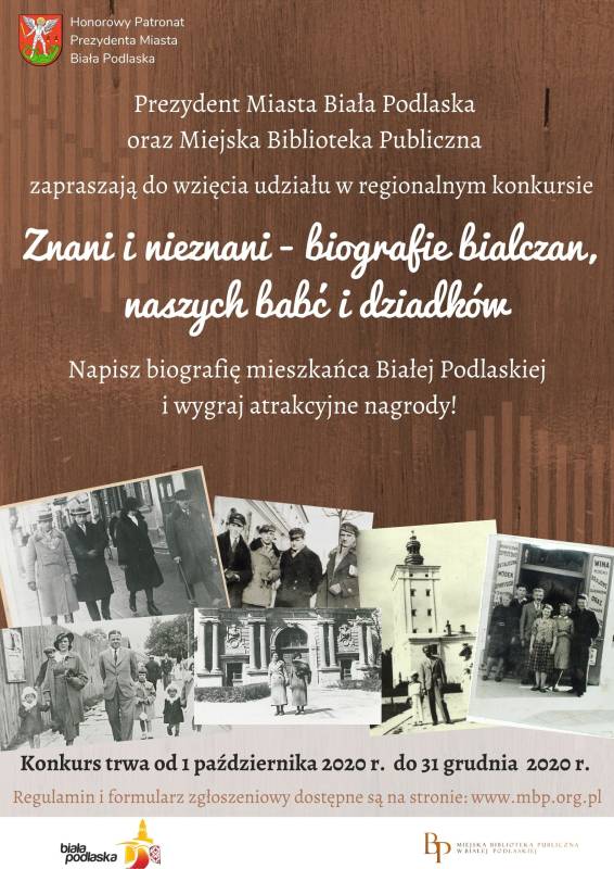 Miejska Biblioteka publiczna zaprasza mieszkańców Białej Podlaskiej – młodzież i dorosłych do udziału w konkursie „Znani i nieznani - biografie bialczan, naszych babć i dziadków”, realizowanym pod patronatem Prezydenta Miasta Biała Podlaska Michała Litwiniuka.
