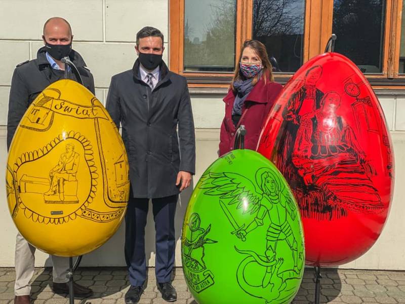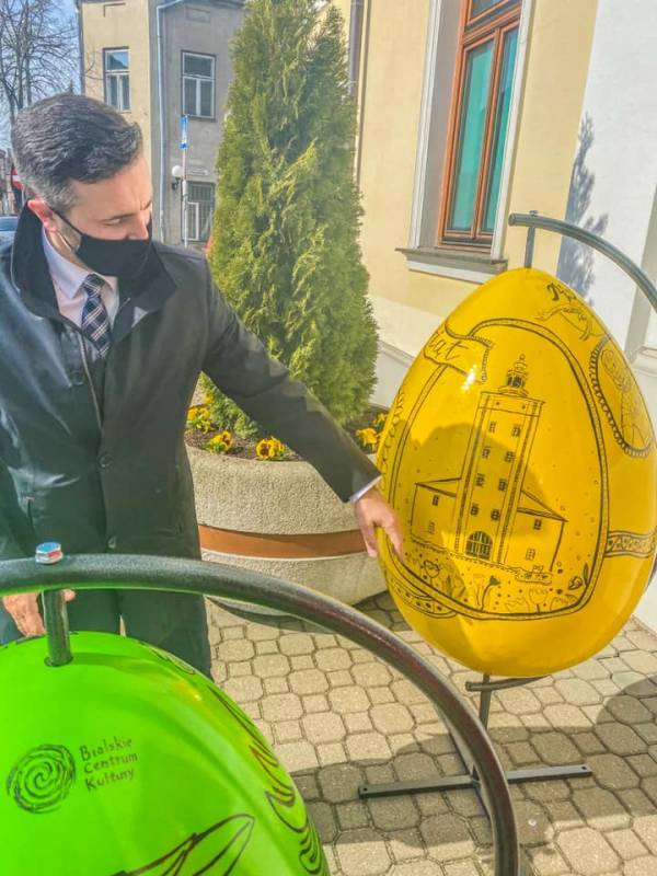 Przy Urzędzie Miasta stoją już nowe dekoracje wielkanocne, o które zadbała miejska spółka Zieleń. To wyjątkowe pisanki, niepowtarzalne - udekorowane rysunkami naszych miejskich motywów przez artystów Bialskiego Centrum Kultury, panią Renatę Sobczak i pana Adama Korszuna. Kolorowych dekoracji będzie w naszej przestrzeni na pewno coraz więcej, zwłaszcza na święta.