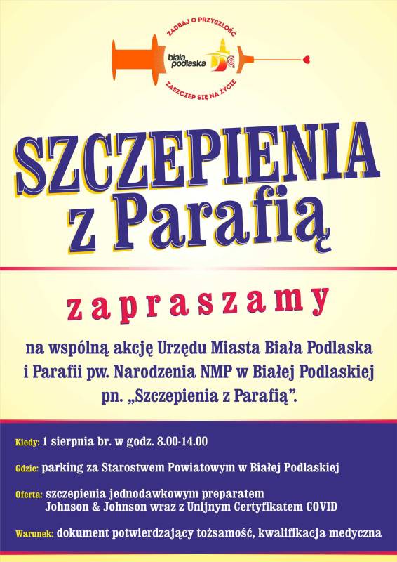 Zapraszamy na wspólną akcję Urzędu Miasta Biała Podlaska oraz Parafii pw. Narodzenia NMP w Białej Podlaskiej pn. „Szczepienia z Parafią!”.