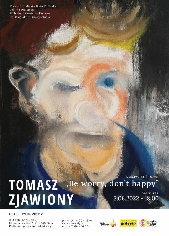 "Na wystawę „Be worry, don,t happy” składają się dwa cykle obrazów. Pierwszy z nich to przedstawienia portretowe, zaś kolejny to prace wielkoformatowe z czasu pandemii. Kameralne małe prace portretowe to rozważania egzystencjalne i próba zmuszenia do zainicjowania tematu istnienia w ogóle. Przedstawienia głównie widzeń sennych to próba skierowania uwagi do namysłu nad rzeczywistością i światem realnym. Na ile to, co widzimy jest realne i czy nie jest to tylko widzeniem sennym, a sen pogłębieniem tego widzenia. Iluzja istnienia może dotykać co jakiś czas, ale nie daje się uchwycić i jest poza zasięgiem, a wszystko poza nią jest realne, przynajmniej takie się wydaje. Cykl obrazów pandemicznych to wielkoformatowe prace będące przedstawieniem problemu izolacji, osamotnienia, braku możliwości, braku wyboru. Ograniczenia jakie zostały nałożone sprawiły, że świat stał się surrealistyczny i fantastyczny, widziany tylko w filmach, a jednak możliwy do zrealizowania w rzeczywistości. Te kilka prac są przełożeniem tych wszystkich prób."