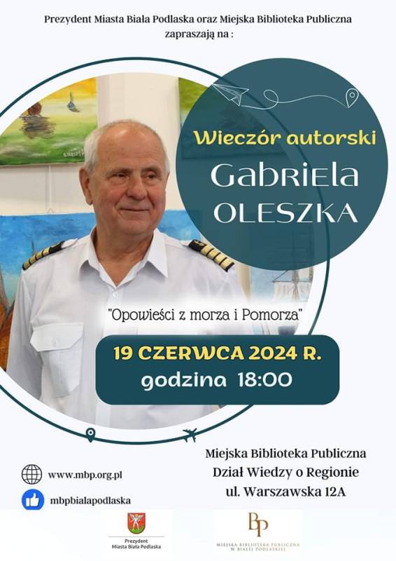19 czerwca 2024 r. (środa) o godzinie 18:00 w Dziale Wiedzy o Regionie Miejskiej Biblioteki Publicznej w Białej Podlaskiej odbędzie się wyjątkowe spotkanie autorskie z Gabrielem Oleszką pt. "Opowieści z morza i Pomorza".