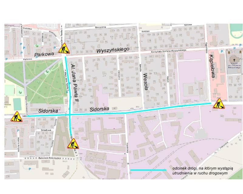W pierwszym etapie zostanie wyłączony z ruchu lewy skrajny pas al. Jana Pawła II od skrzyżowania z ul. Sidorską do skrzyżowania z ul. Parkową oraz częściowo lewy pas na ul. Sidorskiej (na odcinku od Sidorskiej 32 do Sidorskiej 60).