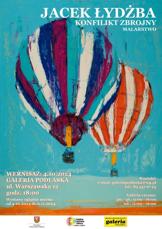 Zapraszamy na wernisaż malarstwa Jacka Łydżby pt. "Konflikt zbrojny", który odbędzie się 4 października 2024 roku o godz. 18:00 w Galerii Podlaskiej przy ul. Warszawskiej 12.