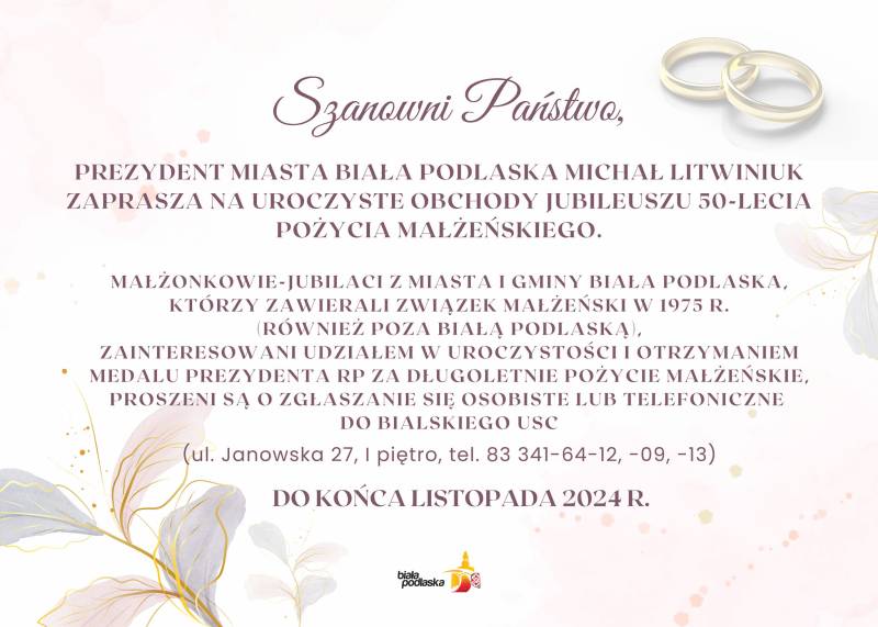 Prezydent Michał Litwiniuk zaprasza osoby obchodzące jubileusz 50-lecia zawarcia związku małżeńskiego do uczestnictwa w uroczystości organizowanej przez Urząd Miasta i Urząd Stanu Cywilnego.