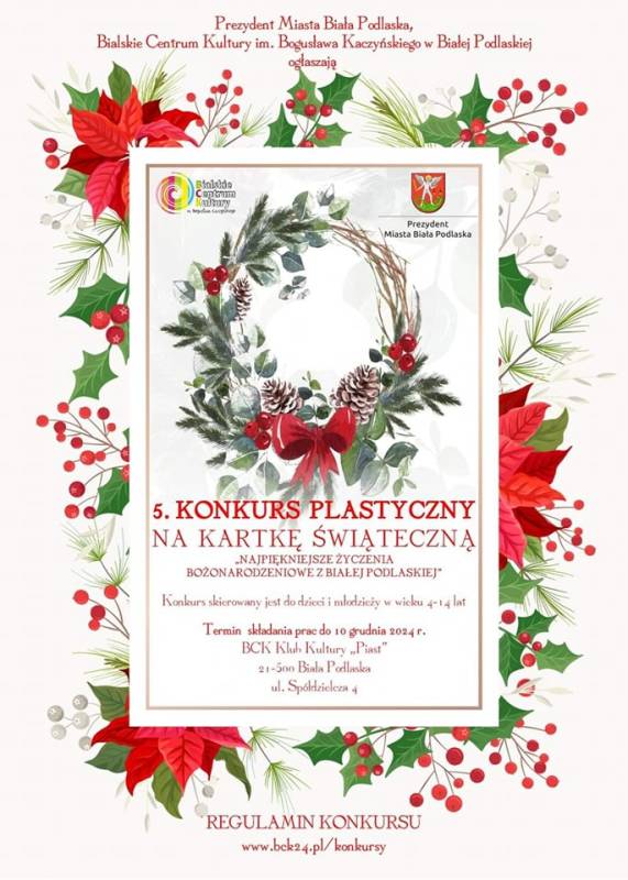 Regulamin oraz karty zgłoszenia dostępne są na stronie www.bck24.pl w zakładce konkursy oraz pod linkiem https://bck24.pl/5-konkurs-plastyczny-na-kartke-swiateczna.