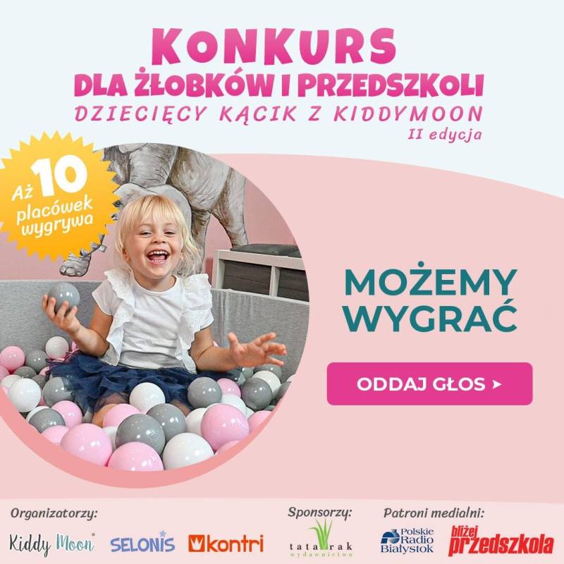 Zespół Żłobków Miejskich w Białej Podlaskiej przystąpił do ogólnopolskiego konkursu "Dziecięcy Kącik z KiddyMoon", w ramach którego można wygrać atrakcyjne nagrody: piankowe place zabaw, suche baseny z piłeczkami, drewniane zabawki - bujaki, balansujące deski, drabinki i książki.