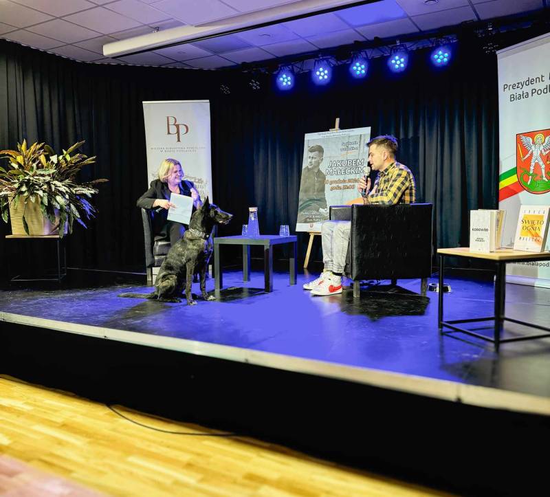 Autor takich książek jak: "Korowód", "Horyzont" czy "Święto ognia" podczas rozmowy z prowadzącą spotkanie dyrektor MBP Renatą Szwed opowiedział m.in. o swoich początkach w obszarze pisarstwa, inspiracjach do tworzenia kolejnych książek i literackich fascynacjach. Małecki pojawił się ze swoją wierną towarzyszką Jurą, która skradła serca czytelników.