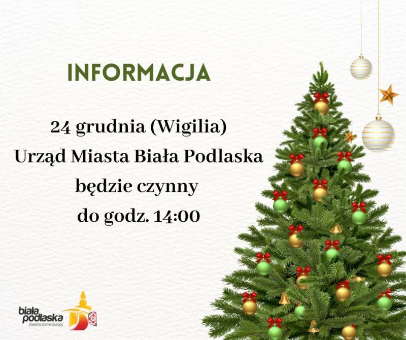 Informujemy, że jutro (24 grudnia) Urząd Miasta Biała Podlaska będzie czynny do godz. 14:00