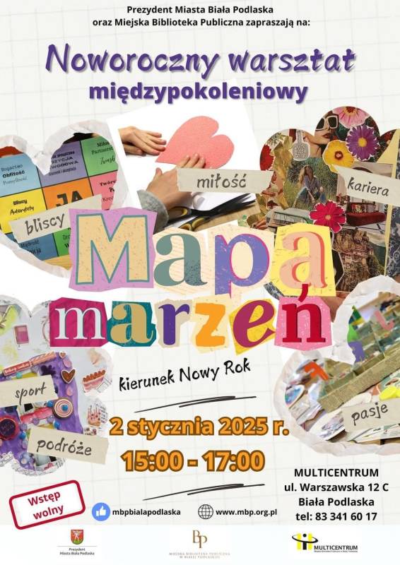 Multicentrum przygotowało noworoczny, bezpłatny warsztat międzypokoleniowy "Mapa marzeń". Odbędzie się on 2 stycznia 2025 r. o godzinie 15:00.