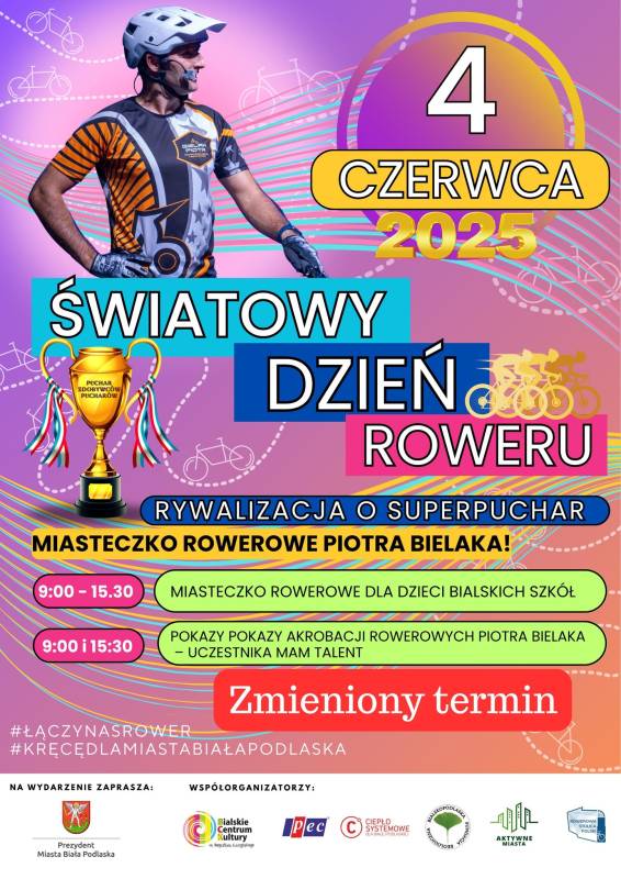 3 czerwca to Światowy Dzień Roweru. Będziemy go obchodzić w Białej Podlaskiej już 4 czerwca od godz. 9:00 na placu Wolności. Na miejscu uczniów bialskich szkół i mieszkańców czekać będzie miasteczko rowerowe, pokazy rowerowe w wykonaniu uczestnika Mam Talent Piotra Bielaka (godz. 9:00 i 15:30).