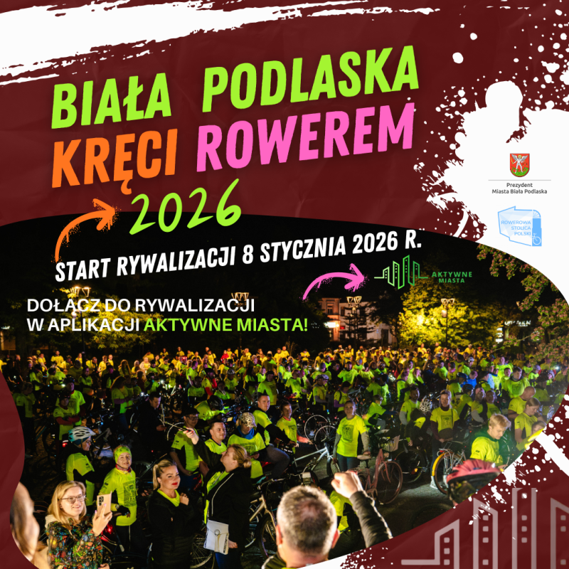 Prezydent MICHAŁ LITWINIUK zaprasza do wspólnej rywalizacji - "Biała Podlaska jeździ rowerem - 2026 "Mistrzowie, kręcimy – bez wymówek, z aplikacją AKTYWNE MIASTA, przez cały rok! Bo rower to nie sezon. To rytm, w którym biją nasze mistrzowskie serca. Zbieramy km od 8 stycznia do końca roku!Dołącz do rywalizacji w aplikacji 2026 – to kolejny rok, w którym jeździmy razem! Dla zdrowia, dla miasta, z bliskimi!