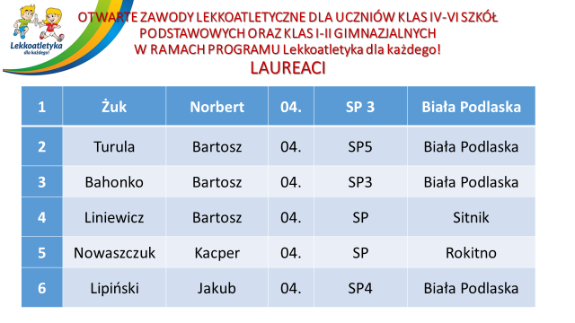Podsumowano współzawodnictwo w ramach otwartych zawodów lekkoatletycznych dla dzieci z klasy IV-VI szkół podstawowych oraz I-II klasy gimnazjum. Zmagania odbyły się w ramach projektu „Lekkoatletyka dla każdego”.