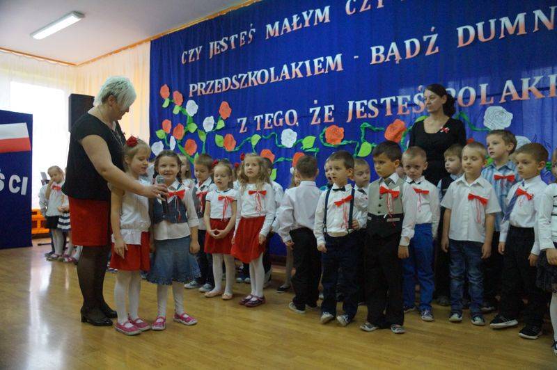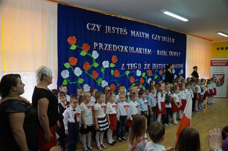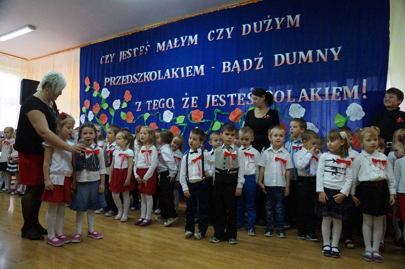 Przedszkolaki z pomocą nauczycielki Jolanty Rusakowicz przygotowały uroczystość, którą otworzyło wprowadzenie pocztu z flagą narodową. Najmłodsi bialczanie odśpiewali też bardzo zdecydowanie Mazurka Dąbrowskiego. Następnie dzieci przywitały wszystkich zaproszonych gości, wśród których znaleźli się rodzice oraz zastępca prezydenta miasta Michał Litwiniuk.
