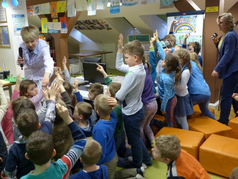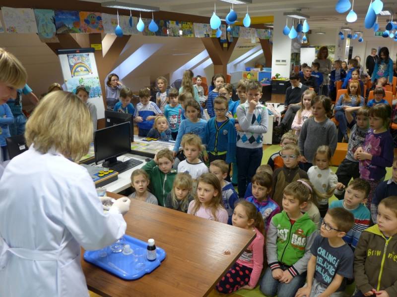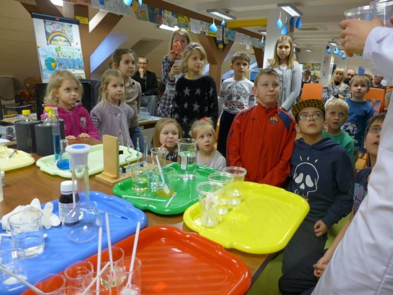 Niewątpliwą atrakcją warsztatów był pokaz eksperymentów i doświadczeń, w którym dzieci brały aktywny udział. Duże zainteresowanie wzbudził także pokaz gry na kieliszkach, podczas którego dzieci mogły przekonać się, że z wody można również wydobyć dźwięki.
