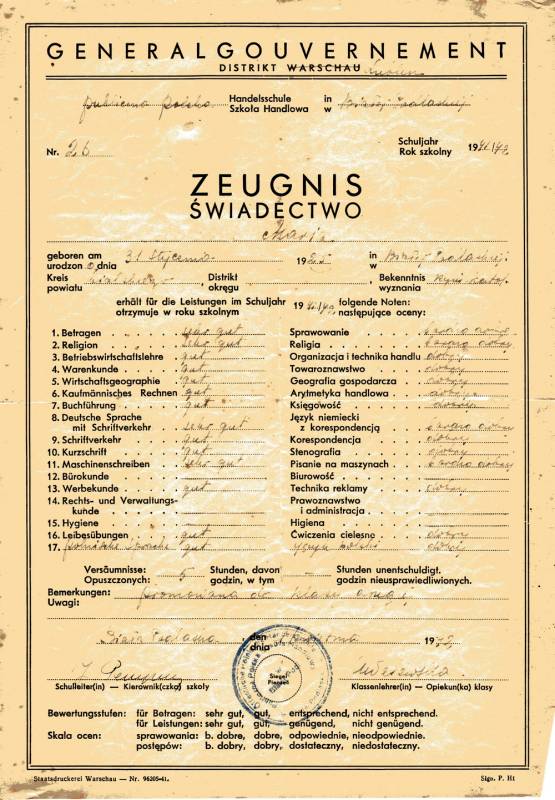 Czego uczyła się młodzież w tamtych czasach? Na świadectwie można znaleźć takie przedmioty jak organizacja i technika handlu, towaroznawstwo, geografia gospodarcza, arytmetyka handlowa czy księgowość. Była także korespondencja handlowa, stenografia, pisanie na maszynie, technika reklamy, higiena, spółdzielczość i język polski jako przedmiot nadobowiązkowy (fot.). Obowiązkowo za to uczono języka niemieckiego z korespondencją.
