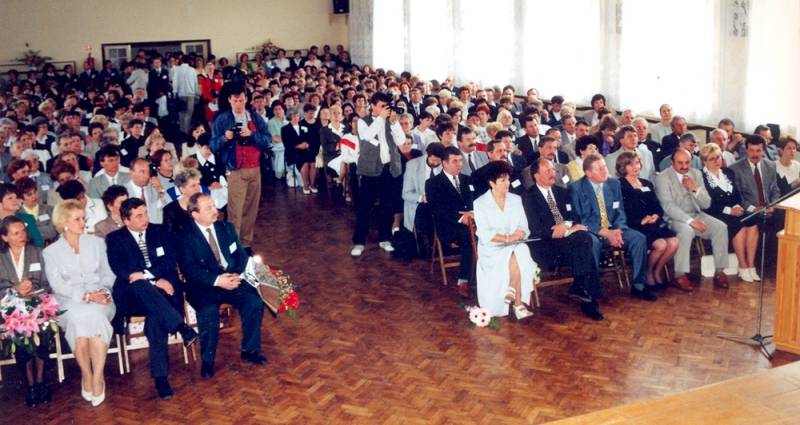 Fot. w kolejności: sala komputerowa, dyrektor M. Borys, , wmurowanie kamienia węgielnego pod nowe obiekty, nowe skrzydło w stanie surowym, I zjazd absolwentów, nowe skrzydło szkoły, dyrektor I. Dłu-gołęcki, podpisanie porozumienia.