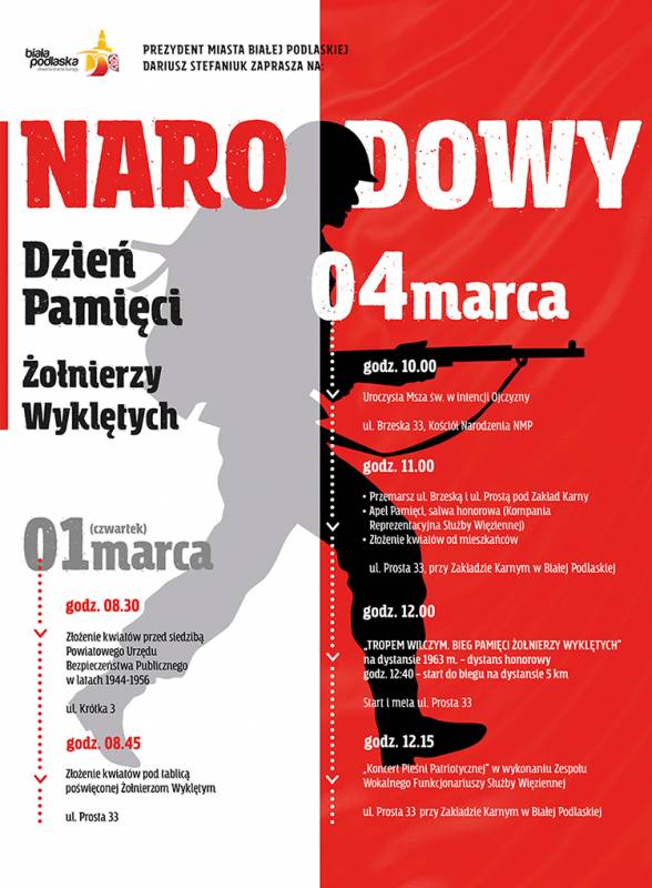 4 marca już tradycyjne będziemy wspominać żołnierzy wyklętych. Z tej okazji przy bialskim zakładzie karnym odbędą się oficjalne uroczystości, których zwieńczeniem będą biegi: symboliczny na dystansie 1963 m oraz 5 km. Trzy dni wcześniej Żołnierze Wyklęci zostaną upamiętnieni złożeniem wiązanek kwiatów.