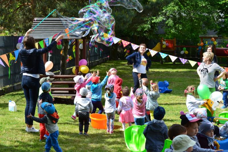 Już po śniadaniu dyrektor Agnieszka Kulicka oraz panie przebrane w barwne stroje z wypożyczalni „Bajka”, przygotowały liczne atrakcje. Było czarowanie słodkości oraz prezentów jak również wspólne zabawy. Zamiast codziennych zajęć maluszkom zaproponowano zabawy na świeżym powietrzu z wesołą muzyką, tańcami, zabawą z chustą animacyjną oraz ogromnymi bańkami mydlanymi.