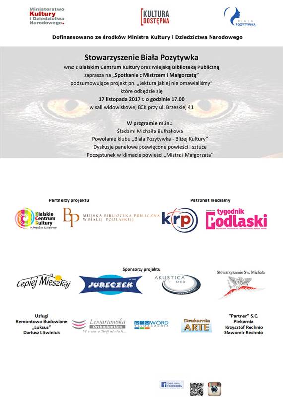 Już od października w stowarzyszeniu Biała Pozytywka trwają przygotowania wydarzenia podsumowującego realizację projektu „Lektura, jakiej nie omawialiśmy”. Ono zbliża się wielkimi krokami. Odbędzie się 17 listopada o godzinie w sali widowiskowej Bialskiego Centrum Kultury przy ul. Brzeskiej 41.