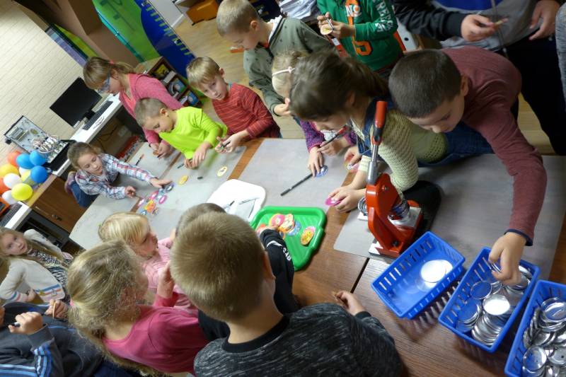 W drugiej części uczestnicy, pod okiem osoby prowadzącej zajęcia mieli okazję samodzielnie wykonywać plakietki „Kocham van Gogha”, korzystając z supermaszynki do składania plakietek.