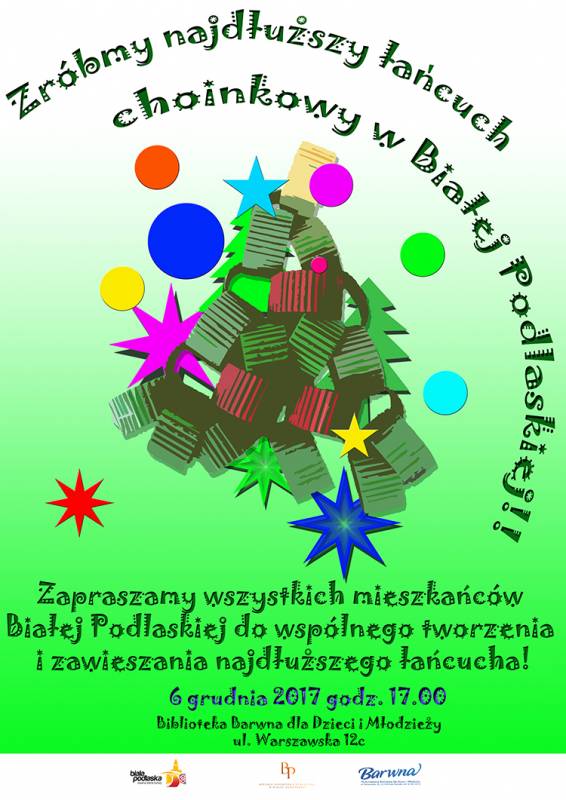 Wyposażeni w błyszczący papier, wielobarwne kartony, brokat, kleje i nożyczki, uczestnicy zajęć z pewnością postarają się, aby łańcuch był nie tylko jak najdłuższy, ale również najpiękniejszy . Wspólnie zawieszą ozdobę na bibliotecznej choince, gdzie łańcuch będzie przyciągać wzrok wszystkich odwiedzających Barwną.