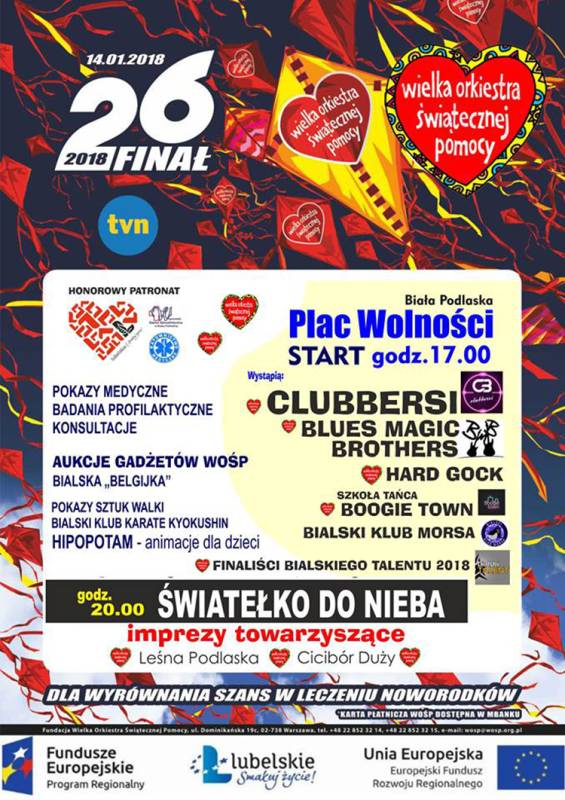 Jak co roku w Białej Podlaskiej zagra Wielka Orkiestra Świątecznej Pomocy. Na ulicach pojawi się ponad 500 wolontariuszy. To o 100 więcej niż w ubiegłym roku. Nie zabraknie koncertów oraz licytacji na placu Wolności. Całość zakończy światełko do nieba. Sztab akcji znajduje się w Domowym Szpitalu przy ulicy Spółdzielczej 5. W pomoc tradycyjnie angażują się pracownicy Bialskiego Centrum Kultury.