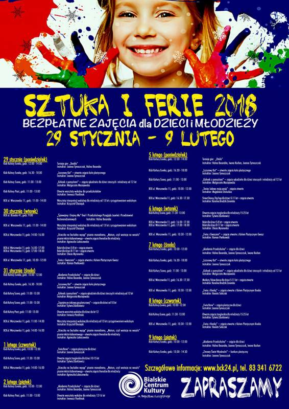 Bialskie Centrum Kultury oraz biblioteki stanęły na wysokści zadania i przygotowały bogatą ofertę na ferię dla dzieci i młodzieży. Każdy znajdzie coś dla siebie. Mamy szczegółowy harmonogram wydarzeń.