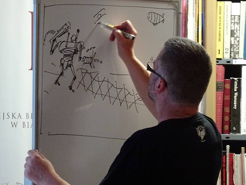 Trwające niespełna trzy godziny warsztaty były pełne celnych wskazówek: jak dobrze opowiedzieć historię, co jest najważniejsze w treści, jakie znaczenie ma puenta opowieści, czy należy wiernie trzymać się raz nakreślonej postaci, czy też w trakcie opowieści bohater może ewaluować? Na te i inne pytania, inspirując słuchaczy, chętnie i wyczerpująco odpowiadali prelegenci. Przyszli twórcy komiksów aktywnie uczestniczyli w warsztatach, które przygotowywały do udziału w ogłoszonym przez Miejską Bibliotekę Publiczną konkursie na komiks „100 lat temu w Białej ”. Usłyszeliśmy i zobaczyliśmy kilka fantastycznych wersji związanych z odzyskaniem przez Polskę niepodległości. Na naszych oczach powstał przykładowy panel komiksowy, opowiadający historię cyborga, który ratuje zamkową wieżę przed zburzeniem i zaborcami. A może bohaterem komiksowym uczynić femme fatale, która używa niecnych środków w dobrych celach i tym sposobem rozprawia się z zaborcą? Nieszablonowe pomysły, które pod wpływem chwili i warsztatów rodziły się w głowach uczestników Fantastycznej Nocy w Bibliotece rozbudziły nasza ciekawość.