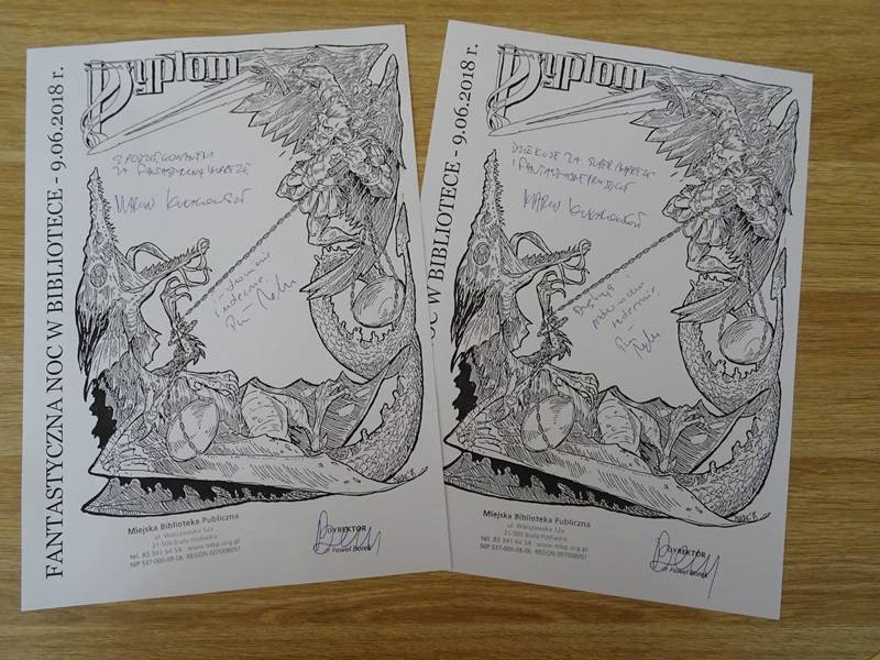Przerwa przed warsztatami była okazją do zdobycia autografu na specjalnie na tę okoliczność przygotowanym przez Marcina Kułakowskiego dyplomie, przedstawiającym swobodną interpretację herbu naszego miasta. Możliwość zakupu książki i zdobycia autografu autora zawsze cieszy się dużym zainteresowaniem wśród uczestników, tak też było w czasie Fantastycznej Nocy w Bibliotece. Przerwa umożliwiła rozmowę mniej oficjalną z zaproszonymi gośćmi, dała też szansę podzielenia się swoimi przemyśleniami i pomysłami.