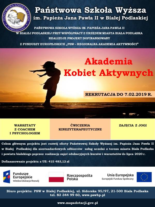 Państwowa Szkoła Wyższa im. Papieża Jana Pawła II w Białej Podlaskiej przy współpracy z Urzędem Miasta Biała Podlaska realizuje projekt „PSW - Regionalna Akademia Aktywności”. Celem głównym projektu jest rozwój oferty uczelni dla niestandardowych odbiorców usług z terenu miasta Biała Podlaska i powiatu bialskiego poprzez realizację zajęć edukacyjnych, kursów i warsztatów. Projekt otwiera się na wszystkie pokolenia od dzieci uczęszczających do przedszkoli, przez młodzież, osoby dorosłe aż po seniorów.