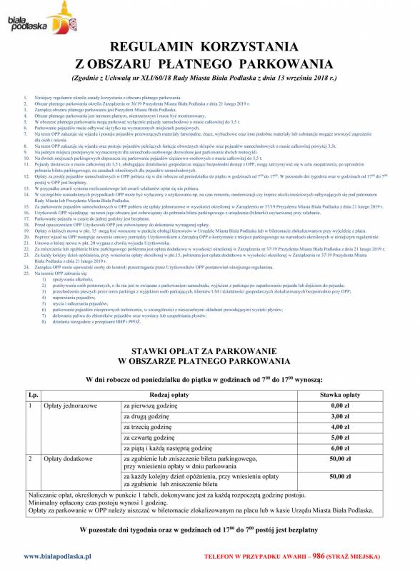 Oprócz zasad obowiązujących kierowców pozostawiających na nim swoje pojazdy regulamin określa stawki opłat. Za pierwszą godzinę postoju kierowcy nie uiszczają opłaty, opłata za drugą godzinę parkowania wynosi 3 zł i za każdą kolejną godzinę wzrasta. Wprowadzenie progresywnych stawek ma na celu zapewnienie płynności i rotacji na parkingu, którego zasadniczym przeznaczeniem jest bezproblemowe parkowanie interesantów Urzędu Miasta.
