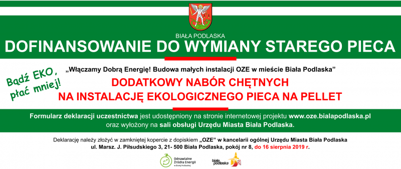 Informujemy, że do 16 sierpnia 2019 r. można składać deklarację uczestnictwa w projekcie "Włączamy dobrą energię! Budowa małych instalacji OZE w mieście Biała Podlaska". W ramach projektu przewidziana jest wymiana starego pieca na nowy, z zasobnikiem i podajnikiem na pellet oraz sterownikiem.