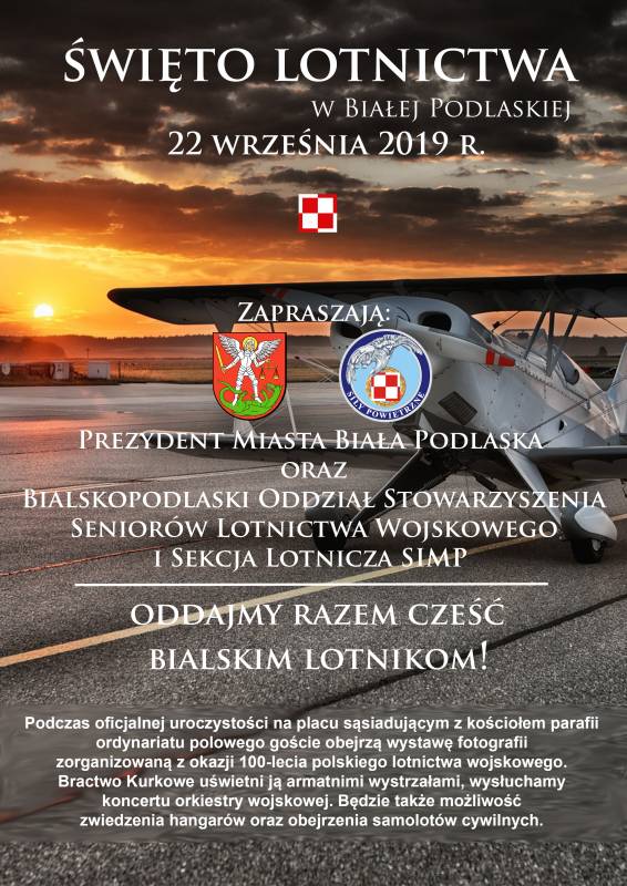 22 września br. odbędzie się w Białej Podlaskiej Święto Lotnictwa, na które zaprasza prezydent Michał Litwiniuk oraz Bialskopodlaski Oddział Stowarzyszenia Seniorów Lotnictwa Wojskowego i Sekcja Lotnicza SIMP. Uroczystości rozpocznie msza św. w kościele garnizonowym przy ul. Dokudowskiej 17.