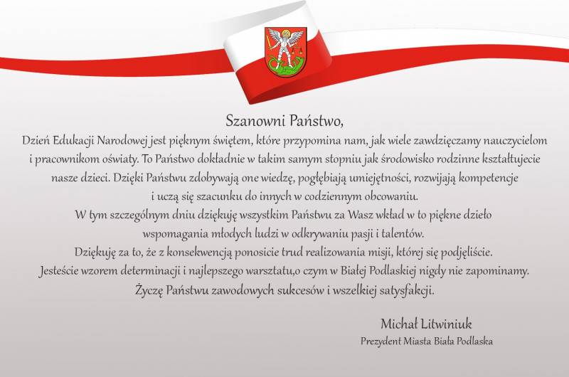 14 października to bardzo ważny dzień, w którym szczególnie ciepło myślimy o nauczycielach i pracownikach oświaty. Na Miejskie Obchody Dnia Edukacji Narodowej Prezydent Michał Litwiniuk zaprasza 15 października wraz z dyrekcją ZSO nr 4 do Szkoły Podstawowej nr 2 im. Bohaterskich Lotników Podlasia przy ul. Akademickiej 8. Uroczystości rozpoczną się o godz. 9.00.