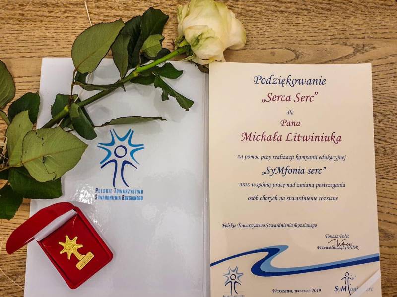 6 października br. w Sali Balowej Zamku Królewskiego w Warszawie odbyła się uroczysta gala zakończenia kampanii informacyjnej "SyMfonia Serc". Tradycją tej uroczystości jest wręczenie honorowych odznaczeń "Ambasador SM” i podziękowań "Serca Serc" dla osób czy firm, które działają na rzecz chorych na SM.W tym roku specjalne podziękowanie PTSR ,,Serca Serc'' otrzymał Prezydent Michał Litwiniuk, a także Pan Grzegorz Szypulski – rehabilitant pracujący w Szkole Policealnej - Medycznym Studium Zawodowym w Białej Podlaskiej. Zaszczytny tytuł Ambasadora SM przypadł Pani Beacie Żak – Kierownikowi Referatu Spraw Społecznych w Urzędzie Miasta Biała Podlaska oraz Panu Sławomirowi Anklewiczowi - Dyrektorowi Szkoły Policealnej - Medycznego Studium Zawodowego w Białej Podlaskiej.