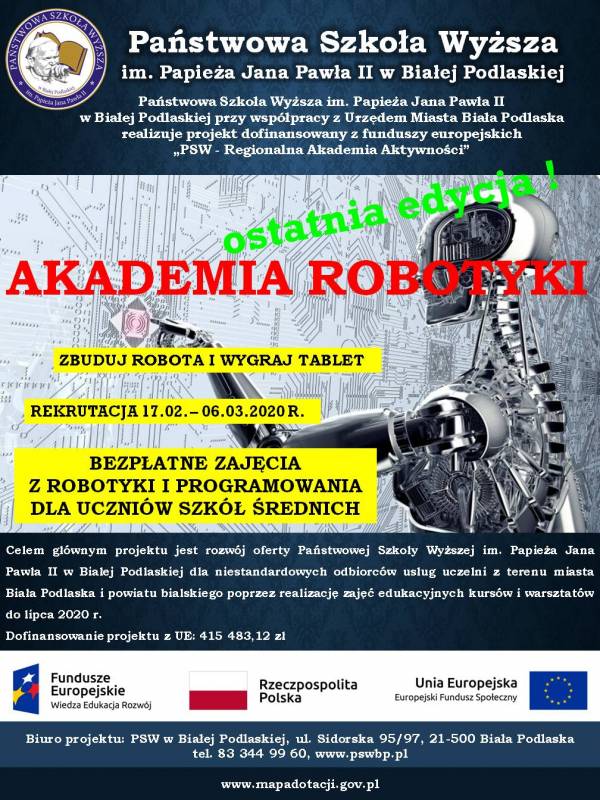 Do 6 marca br. trwa rekrutacja Państwowej Szkoły Wyższej im. Jana Pawła II do trzeciej i jednocześnie ostatniej edycji Akademii Robotyki z projektu „PSW - Regionalna Akademia Aktywności”.