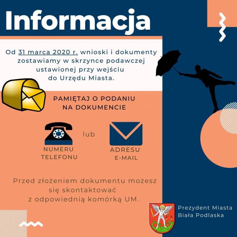 W celu przeciwdziałania rozszerzającej się pandemii koronawirusa SARS-CoV-2 informuję, że Urząd Miasta Biała Podlaska oraz Urząd Stanu Cywilnego od dnia 31 marca 2020 r. do odwołania przyjmował będzie wnioski i dokumenty od mieszkańców za pomocą skrzynki podawczej, ustawionej przed wejściem do budynku.