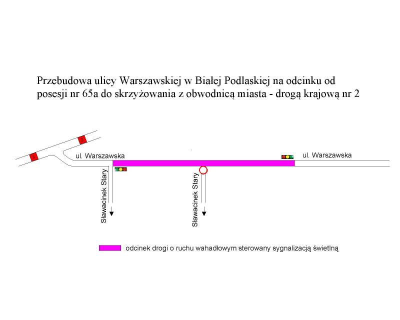 W związku z rozpoczęciem ostatniego etapu przebudowy ul. Warszawskiej w Białej Podlaskiej na odcinku od posesji nr 65A do skrzyżowania z obwodnicą miasta informujemy, że od dnia 19.08.2020 r. do 02.11.2020 r. wystąpią utrudnienia w ruchu na przedmiotowym odcinku polegające na wyłączeniu z ruchu jednego pasa jezdni i wprowadzeniu ruchu wahadłowego sterowanego sygnalizacją świetlną.