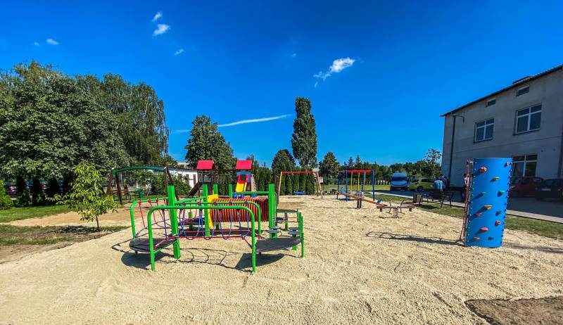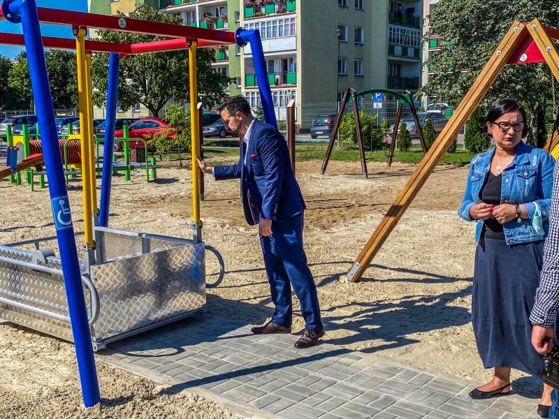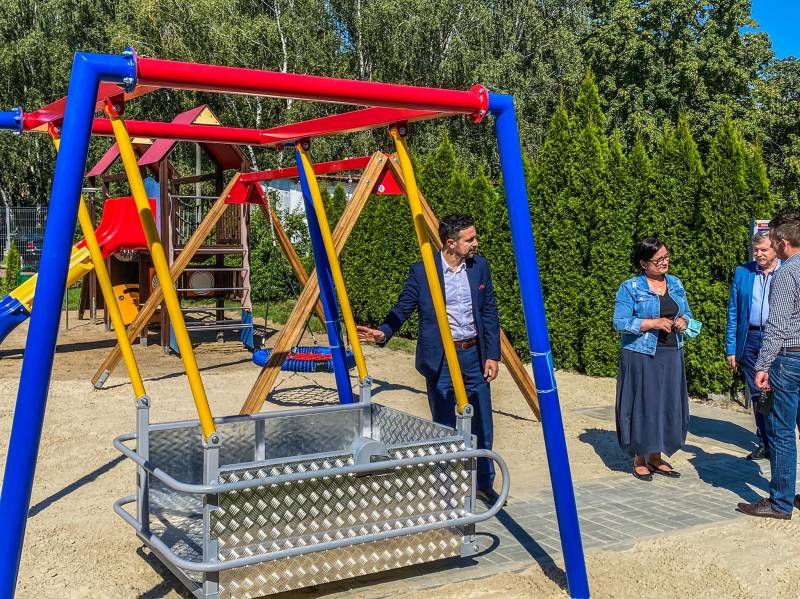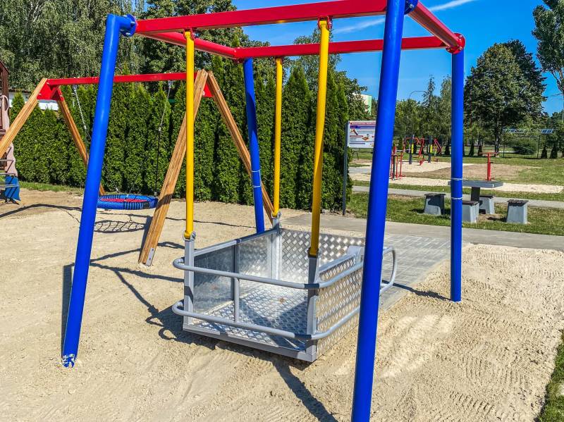 Na pięknym placu zabaw i rekreacji znajduje się m.in. rowerek dla osób niepełnosprawnych oraz huśtawka dla wózków inwalidzkich.