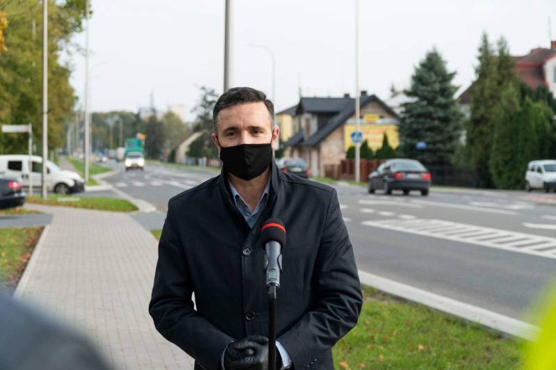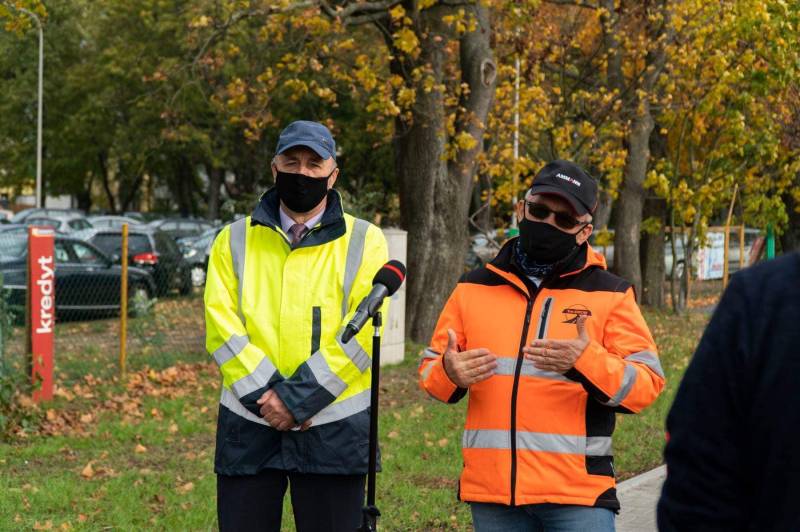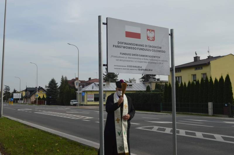 Prezydent Michał Litwiniuk wraz z panem wicewojewodą Robertem Gmitruczukiem, ks. dziekanem Marianem Danilukiem, prezesami realizujących inwestycję firm: Tre-Drom - panem Wiesławem Harasimiukiem i Budomex - panem Eugeniuszem Izdebskim oraz zastępcą prezydenta - panem Maciejem Buczyńskim i panią naczelnik Wydziału Inwestycji UM Sylwią Golik odsłonili tablicę informacyjną o przedsięwzięciu, co jest symbolicznym przekazaniem mieszkańcom do bezpiecznego użytku przebudowanej ulicy Warszawskiej.