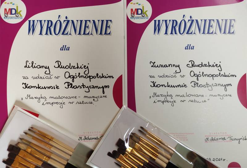 Czwartoklasistki Lilianna i Zuzanna Rudzkie zostały wyróżnione w Ogólnopolskim Konkursie Plastycznym w kategorii klas IV- VIII „Muzyką malowane - muzyczne impresje w sztuce", zorganizowanym przez Młodzieżowy Dom Kultury w Mysłowicach.