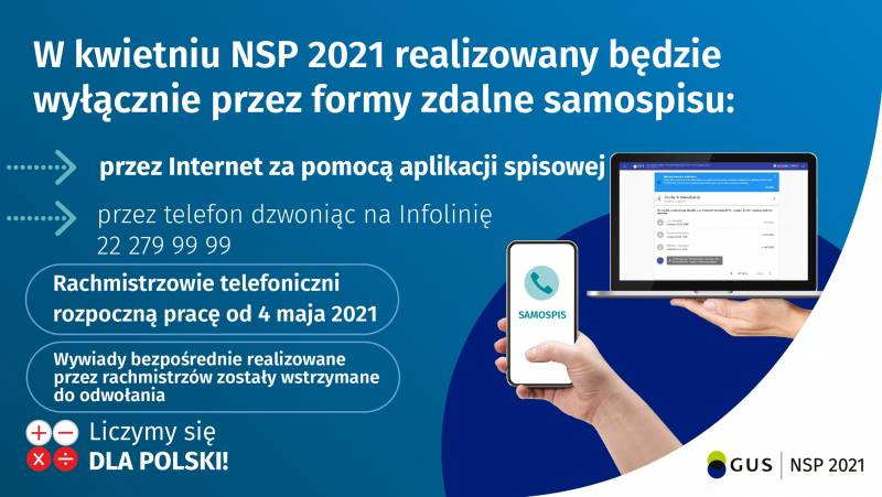 W związku z rozpoczęciem Narodowego Spisu Powszechnego Ludności i Mieszkań 2021 i jego wydłużeniem do 30 września br. uprzejmie informujemy, że podstawową metodą realizacji obowiązku spisowego jest samospis poprzez aplikację: kliknij tutaj