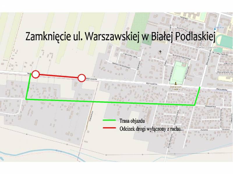 Od 17.05.2021 r. do 21.05.2021 r. nastąpi zmiana organizacji ruchu polegająca na wyłączeniu z ruchu pojazdów odcinka ulicy Warszawskiej.