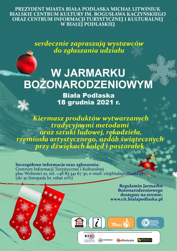 Serdecznie zapraszamy wystawców do zgłaszania udziału w Jarmarku Bożonarodzeniowym. Miło nam będzie gościć twórców ludowych, artystów, rękodzielników oraz wytwórców smakołyków na stół świąteczny wytwarzanych tradycyjnymi metodami. Szczegółowe informacje - Centrum Informacji Turystycznej i Kulturalnej w Białej Podlaskiej plac Wolności 10, tel. 83 341 67 30.